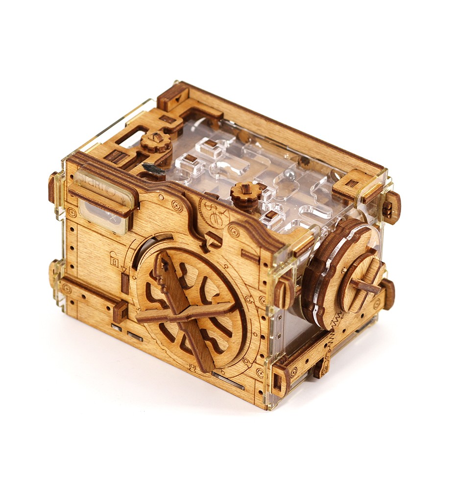 Conçu en bois et plexiglas, il renferme un mécanisme d’ouverture unique basé sur un labyrinthe de billes. Insérez une pièce de monnaie, résolvez l’énigme du labyrinthe et tentez de déclencher l’ouverture du compartiment secret.
